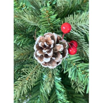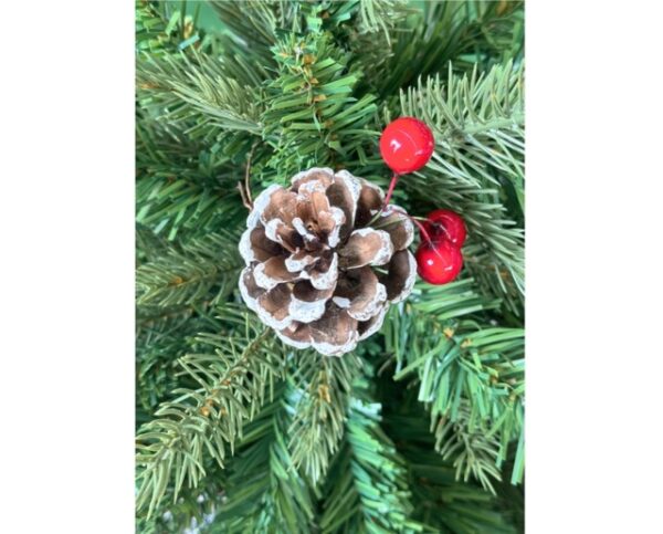 Adorned with pinecones lightly dusted with artificial snow and red berries, and supported by a sturdy metal base.