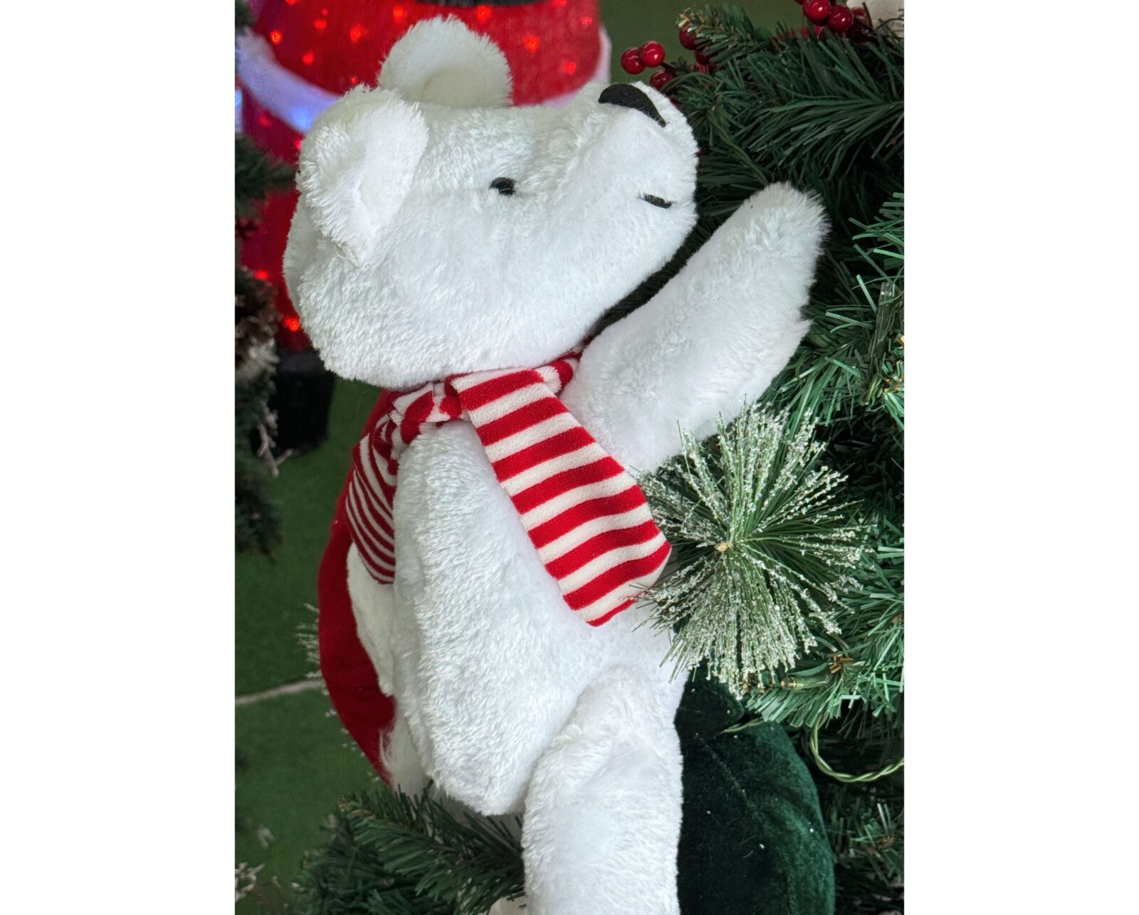 Bring enchantment to your holiday dΓ©cor with this magnificent 1.8 m tall Santa Claus set. Santa stands beside a beautifully decorated Christmas tree, lovingly accompanied by a cute white teddy bear climbing on the branches. In his left hand, Santa holds a lantern, adding a warm and magical glow to your festive atmosphere.