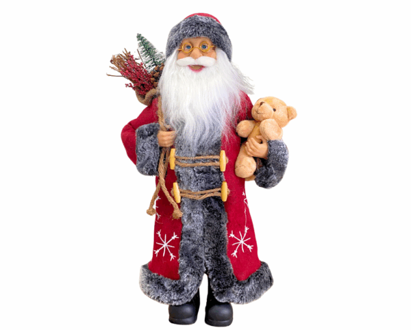 Add a festive touch to your dΓ©cor with this beautiful 45 cm tall Santa Claus. Made with a realistic PVC body and dressed in a high-quality polyester costume, he carries gifts on his shoulder and holds a Teddy-bear in his left hand for a charming seasonal look.