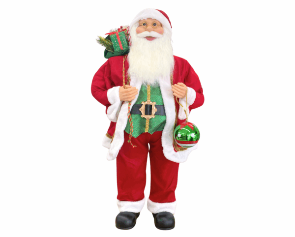 Add a festive touch to your dΓ©cor with this beautiful 90 cm tall Santa Claus. Made with a realistic PVC body and dressed in a high-quality polyester costume, he carries gifts on his shoulder and holds a Christmas ballΒ in his left hand for a charming seasonal look.