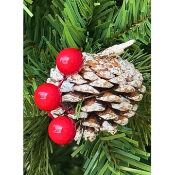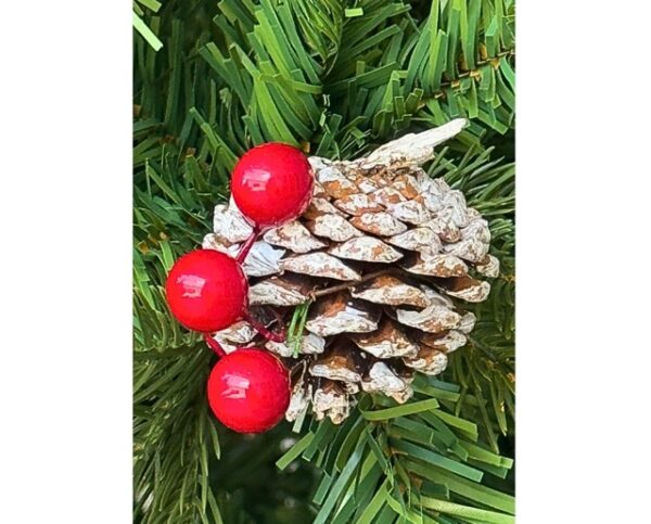 Decorated with pinecones lightly dusted with artificial snow and red berries