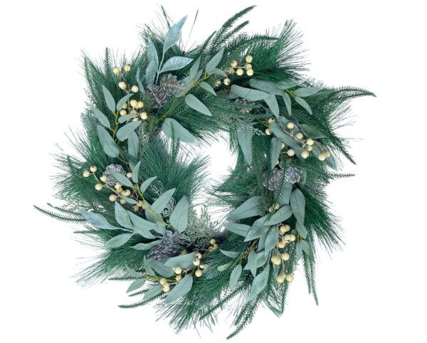 Add a touch of elegance to your home with this 40 cm Christmas wreath. Made from artificial pine branches and accented with lush green foliage, it is beautifully adorned with small golden little balls for a festive yet refined look.