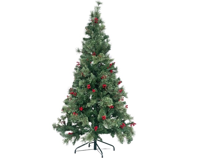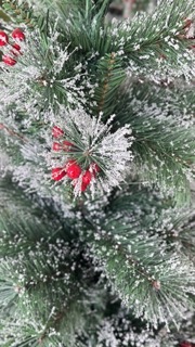 The traditional long-needle branches are lightly dusting of artificial snow and accented with small red berries, giving the tree a charming ready-to-display look. Ideal for living rooms, offices, or entryways, it can be further decorated with lights and ornaments to enhance its festive spirit.