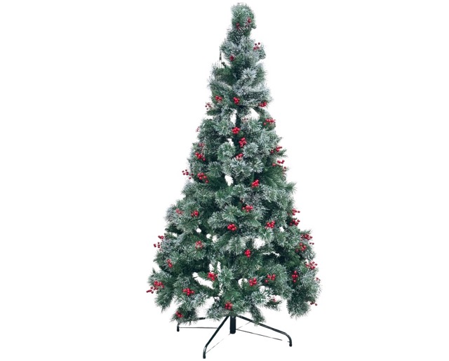 The traditional long-needle branches are gently dusting of artificial snow and decorated with small red berries, giving the tree an elegant, festive appearance straight out of the box. Ready to enhance with lights, ornaments, and garlands, this tree creates a stunning centerpiece for any holiday décor.