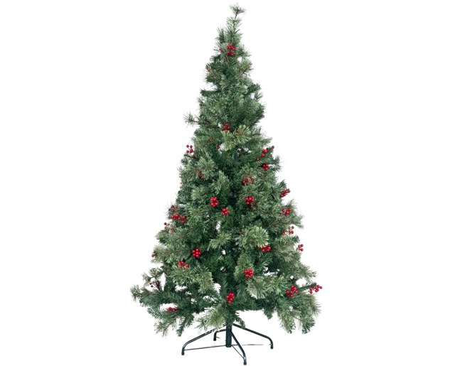 The branches feature lighter star-shaped tips delicately accented with small red berries, giving the tree a decorative and festive appearance even before you add ornaments. Its size makes it an ideal centerpiece for spacious living rooms, offices, or event halls, ready to shine with your favorite lights, baubles, and garlands.