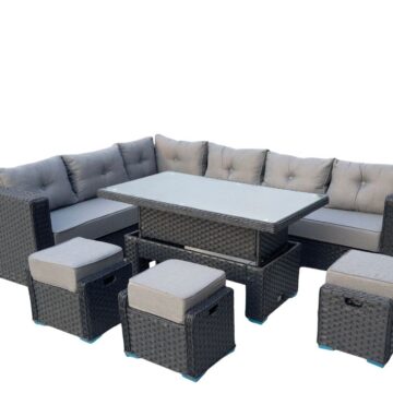 Create an inviting and stylish outdoor lounge with this large modular corner sofa set, configurable as a right-hand or left-hand corner to perfectly suit your space. Designed for both relaxation and entertaining, the set includes a central coffee table with dual-height positions (H 44 cm or H 75 cm), allowing seamless use as a low lounge table or a dining-height table.