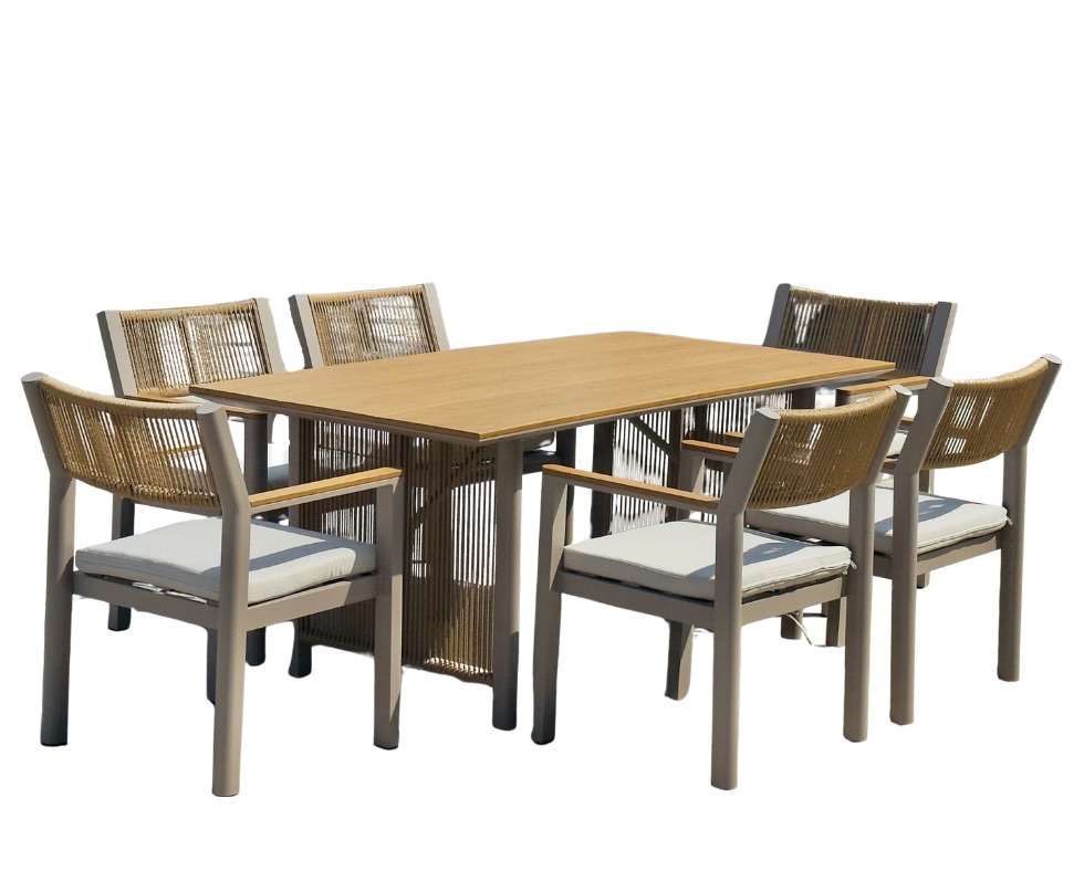Elegant, durable, and easy to maintain, this 5-piece outdoor dining set combines a cappuccino epoxy-coated aluminum structure, twisted PE wicker weaving, and a polywood tabletop for a refined and long-lasting outdoor dining experience. Designed for terraces, gardens, and poolside spaces, it offers both style and comfort for everyday outdoor living.