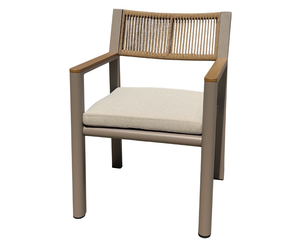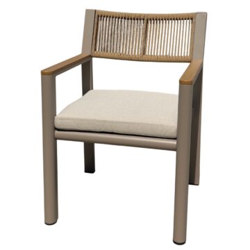 The armchairs feature comfortable light beige polyester cushions designed for pleasant outdoor dining.