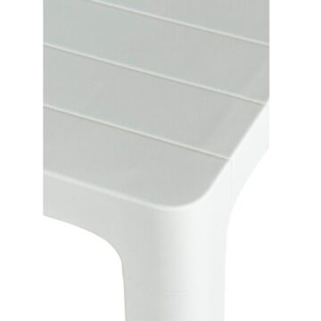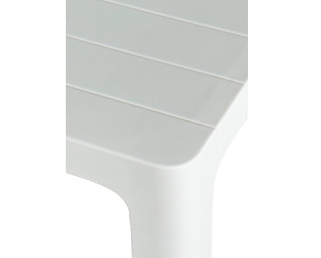 This practical and stylish white KD plastic side table is made from durable polypropylene. Its rounded edges on the tabletop and legs enhance safety and ergonomics. The removable legs are easily secured with stainless steel screws, and the tabletop features subtle grooves for added style and functionality.