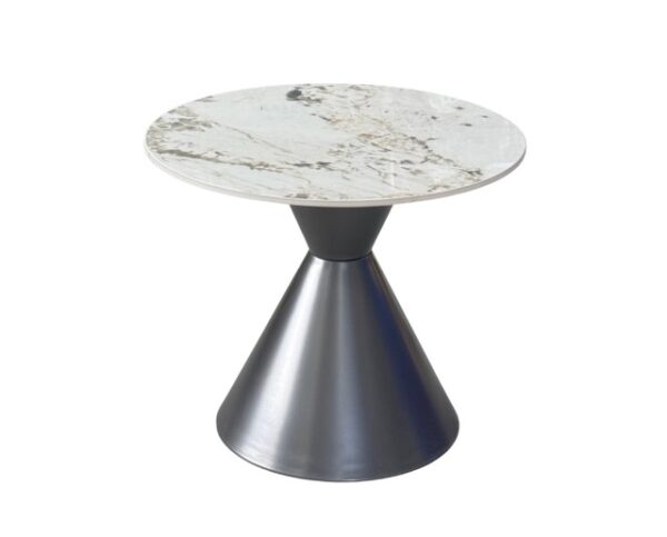 With a diameter of 59 cm and a height of 50 cm, this table is ideal as a side table or accent piece. It stands on a unique metal base composed of inverted cone shapes, giving it a contemporary and sculptural design.