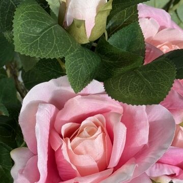 Artificial pink rose bush, H 125 cm x Ø 50 cm. This remarkably realistic reproduction perfectly captures the beauty of a real rose plant — from its lush green leaves to its delicate pink blossoms. So lifelike that many will be fooled at first sight!