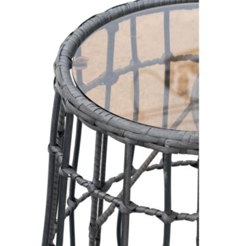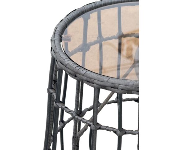 –A small central round table completes the set, featuring a tinted tempered glass top and a metal base that matches the chair legs.