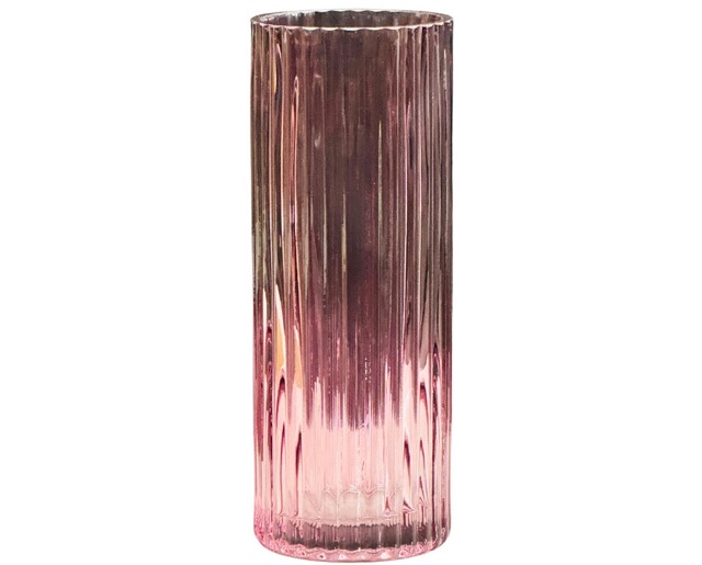 Charming rose-tinted glass vase, 20 cm high and 8 cm in diameter, featuring fine horizontal striations that add texture and visual depth. Its soft pink hue and clean rounded shape bring a touch of warmth and elegance to any interior, perfect for fresh or dried floral arrangements.