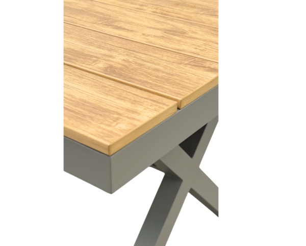 Discover our new table (L 150 x W 90 x H 75 cm), designed to combine style, durability, and practicality. Its full aluminum structure is coated with a highly resistant powder coating that withstands impacts, UV rays, and all weather conditions. The slatted tabletop in polywood – an indestructible synthetic material – offers the warm look of natural wood without requiring any maintenance, while retaining its color over time.