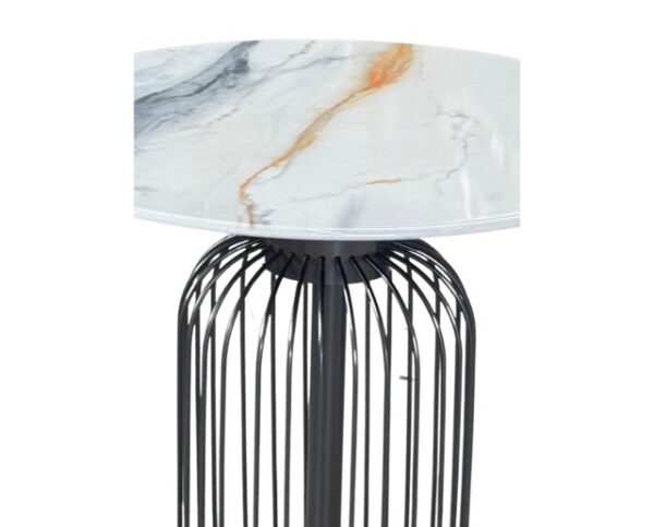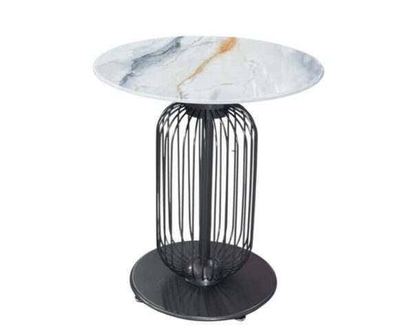 This model measures Ø 50 cm and stands 55 cm high — ideal as a side table next to a sofa, armchair, or in a modern living space. The tabletop is supported by a sculptural metal cylinder base, crafted from black-painted iron rods for a unique and artistic design.