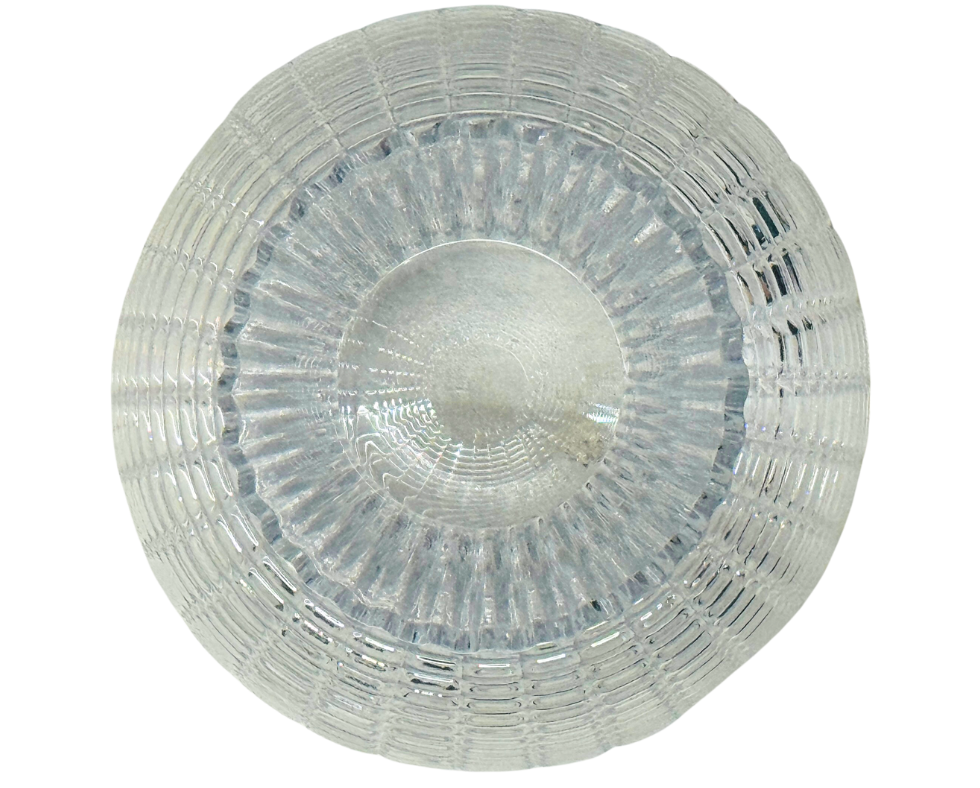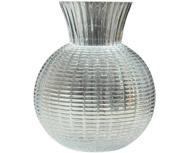 Elegant translucent glass vase featuring a globe-shaped body and a tall collar neck. Its delicately textured surface, adorned with fine vertical ridges, creates a subtle play of light and adds a refined, modern touch. Dimensions: H 25 x Dia max 19 cm.