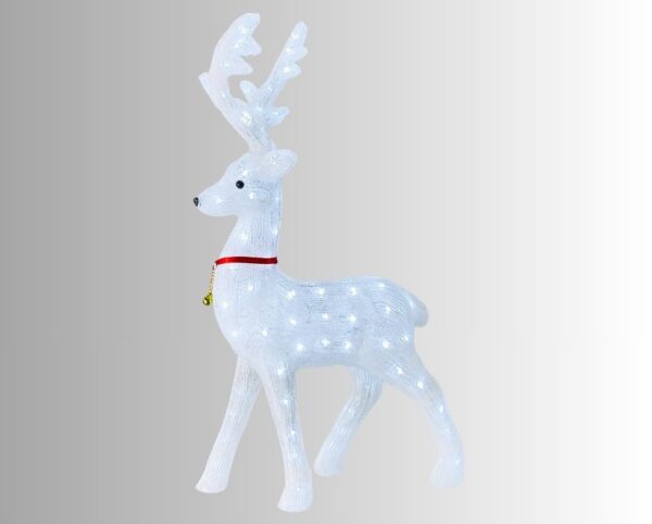 Add a festive touch to your home or garden with this L 75 x H 133 cm. tall translucent resin reindeer, featuring a bright red collar and numerous embedded LED points that illuminate the figure from within. Weatherproof and durable, it creates a charming glowing effect at night.
