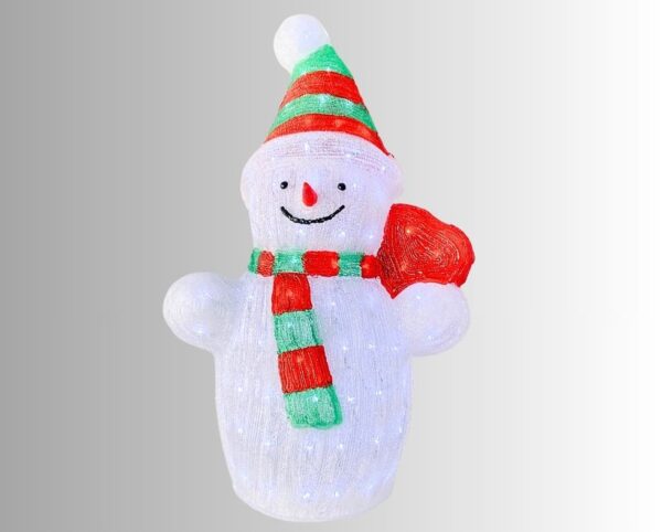 Bring festive cheer to your décor with this 80 cm tall translucent resin snowman, featuring a green and red hat and scarf. Embedded LED lights illuminate the figure from within, creating a warm and enchanting glow at night.